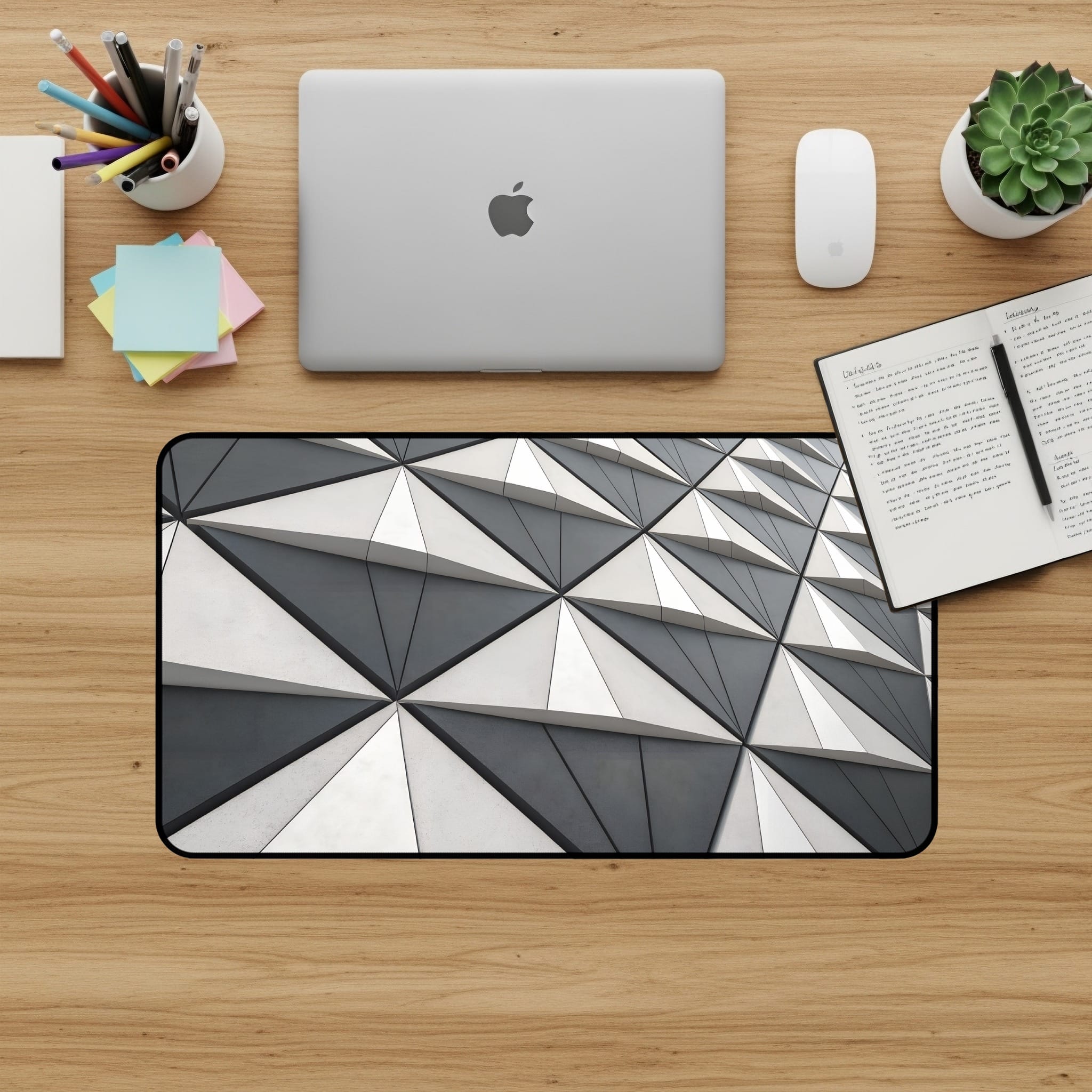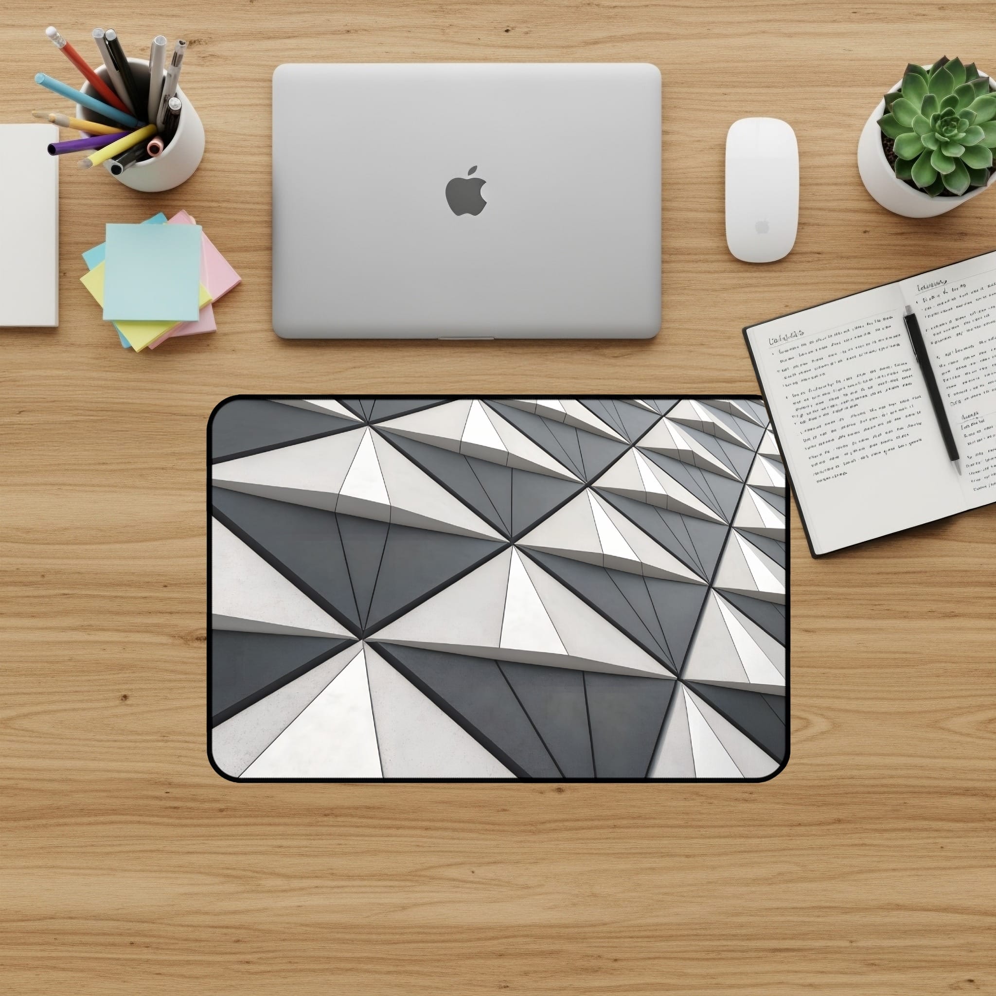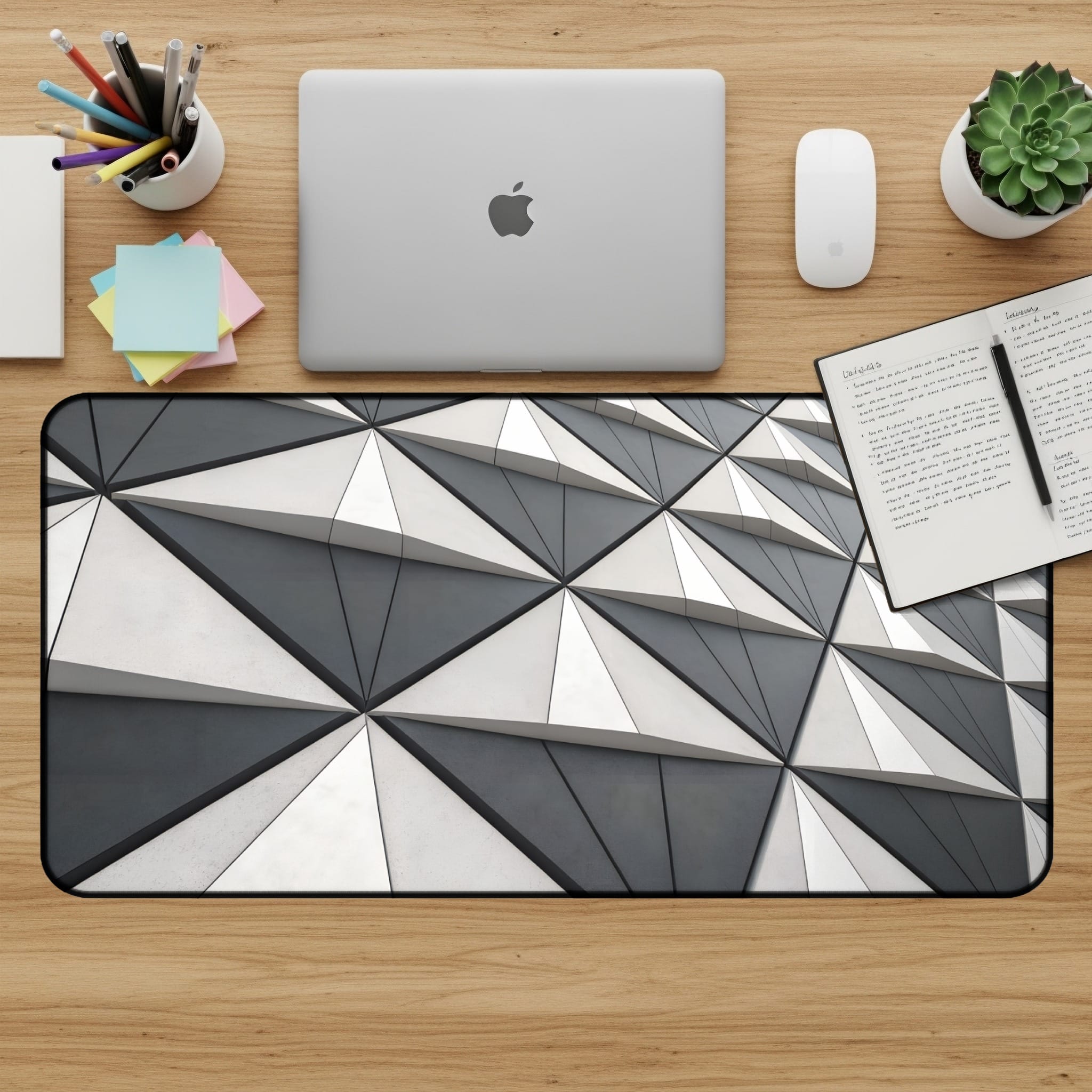 Enhance your workspace with our geometric triangle pattern desk mat. This eye catching desk pad is not just a stylish accessory, it also provides a smooth and comfortable surface for your mouse and keyboard ⌨️🖱️. Perfect for home offices, gaming setups, or adding a touch of modern design to any desk! 🏢🏡