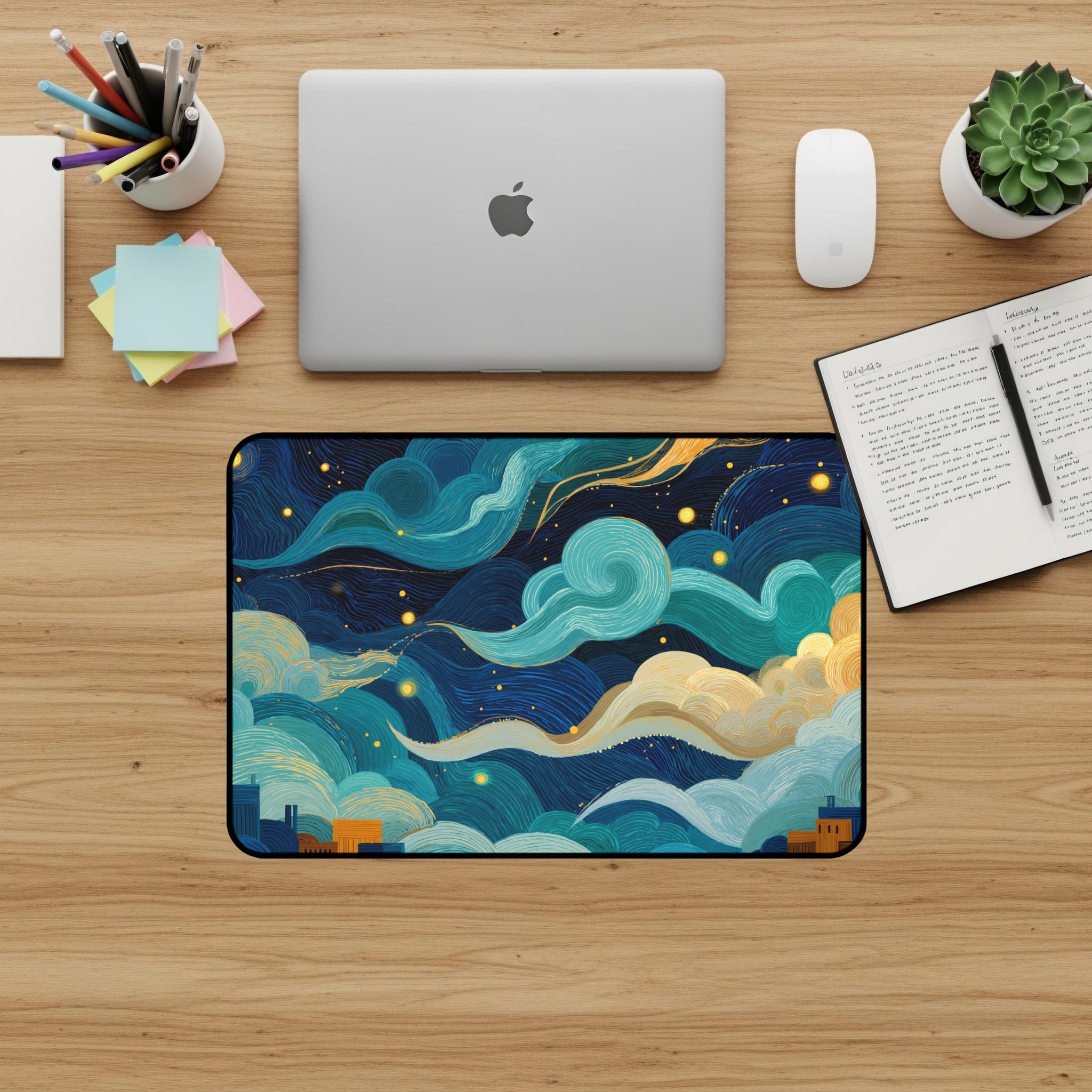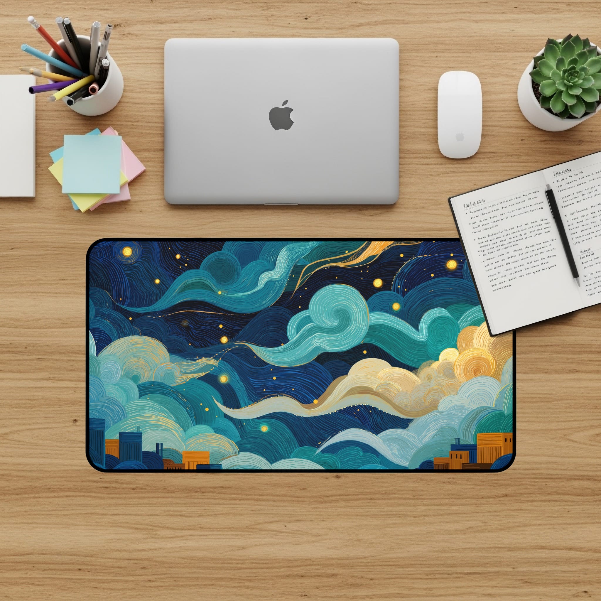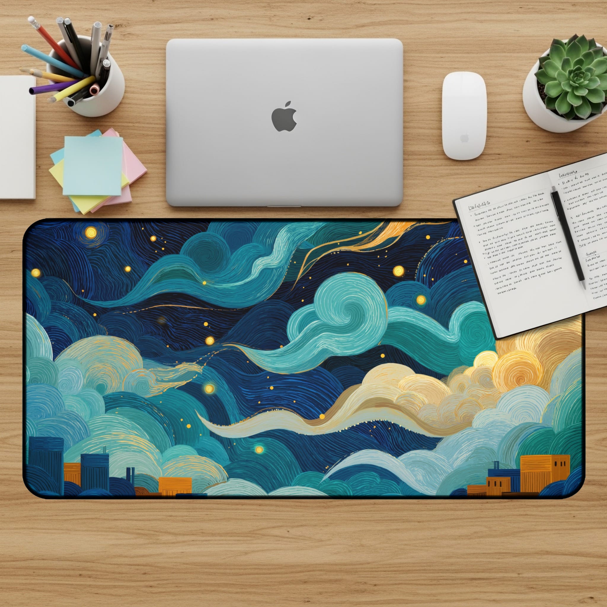 Elevate your workspace with this stunning desk mat featuring an abstract night sky over a cityscape. This captivating design brings a touch of artistic flair to your desk setup and enhances your work or gaming experience. Get ready to fall in love with your desk setup all over again! 💖